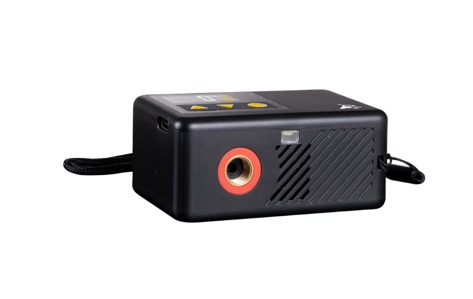 Accessories: 1 x carrying strap, 1 x hose with Schrader connection, 1 x charging cable, 1 x ball needle, 1 x Presta valve, 1 x Dunlop valve