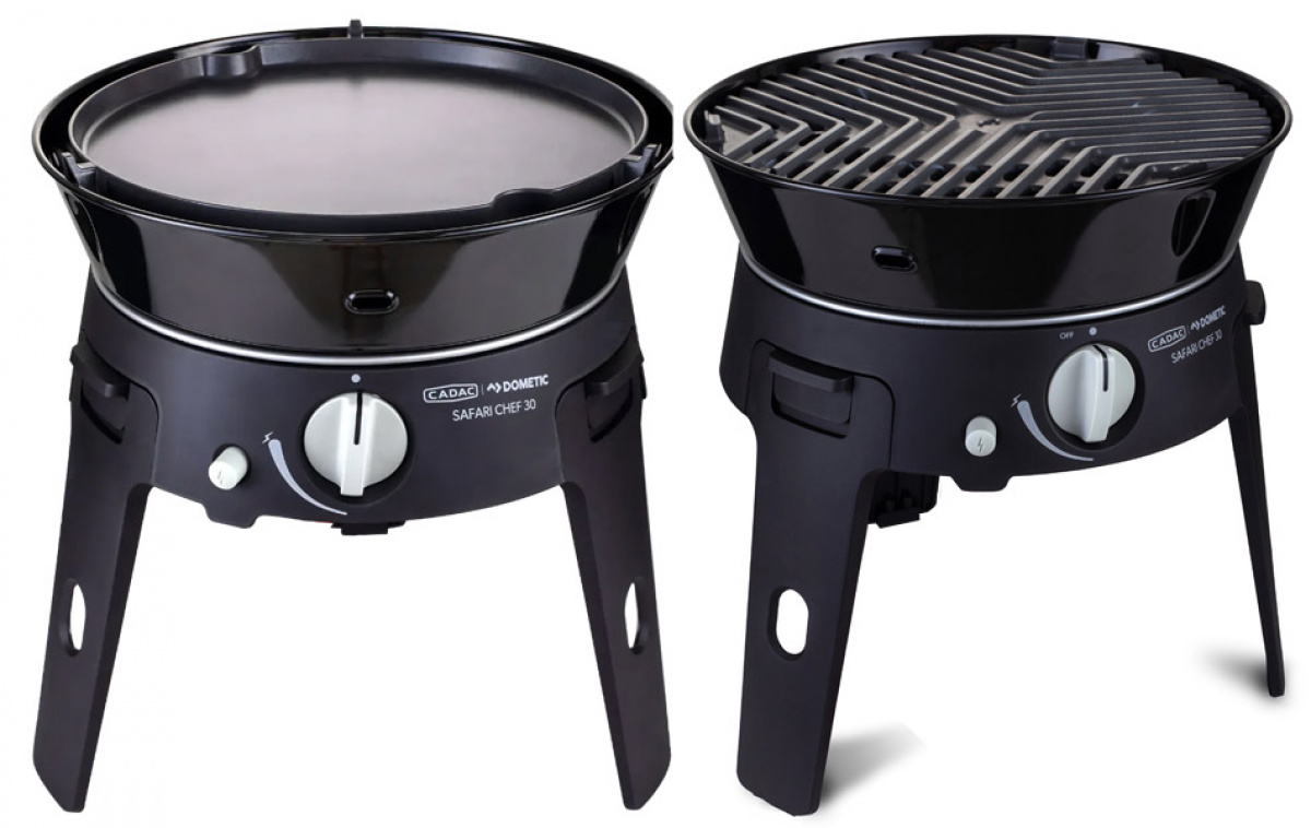 • The Compact 4-in-1 Outdoor Gas Grill Safari Chef 30 is a compact and versatile gas grill, perfect for travel and holidays. Weighing only 5.5 kg and equipped with four cooking surfaces – a pot stand, BBQ grill, a flat griddle, and a lid that can also be used as a pot – this grill offers endless possibilities for outdoor cooking.