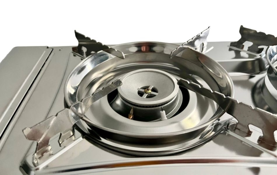 The stove is made of stainless steel for long-lasting durability and easy cleaning. It features piezo ignition and a flame failure safety device, ensuring safe and convenient use without the need for matches.