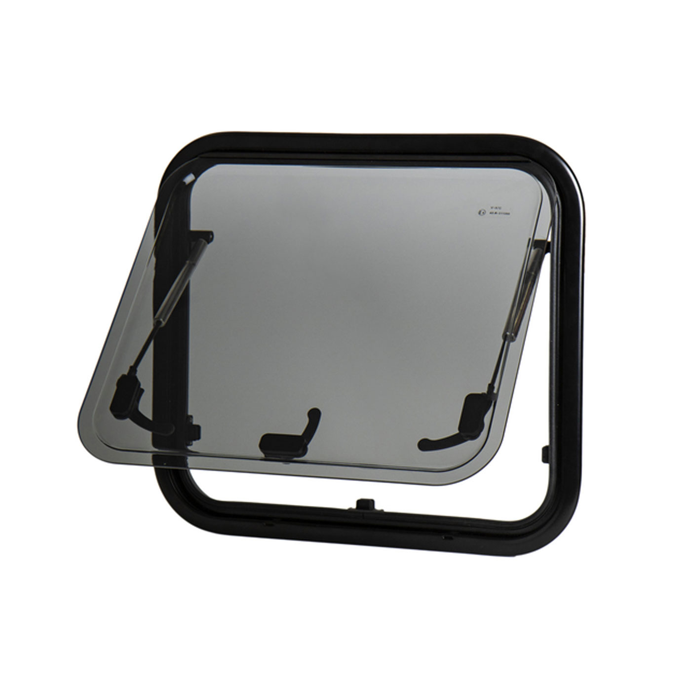 Carbest Comfort pop-out window with double glazing that is tinted acrylic glass with UV protection and a frame made of high-quality aluminium alloy. Flat on the outside and curved on the inside. Includes infinitely adjustable telescopic window arms in stainless steel. Designed for a wall thickness between 28-32 mm.