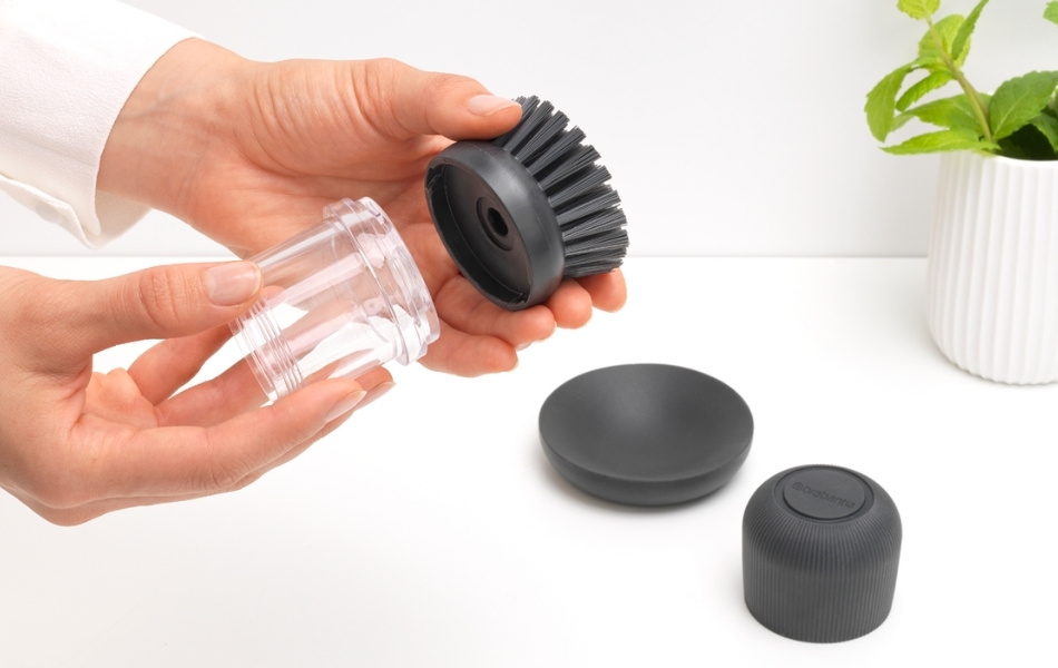 The transparent container makes it easy to see when it is time to refill. Dishwashing liquid is added through a screw opening with a generous opening. A practical holder is included to collect excess water when the brush is not in use.