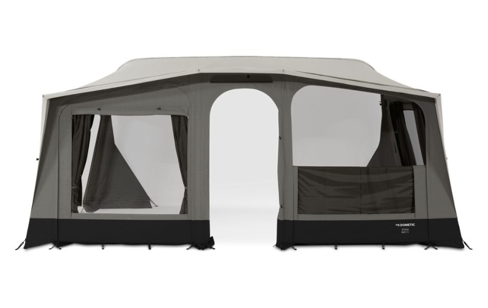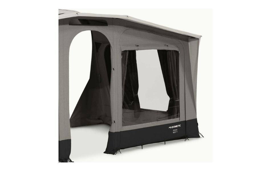 Dometic Stuga Rest is a classic A-measured awning with a steel frame and the market’s first awning made from 100% polypropylene. The dope-dyed material provides superior UV resistance, long durability, easy cleaning, and complete waterproofing. The awning features a centered entrance for easy access, large windows with external zippered blackout covers, and soft removable curtains. The adjustable steel frame provides stability, and a comfortable depth of 250 cm creates plenty of space.