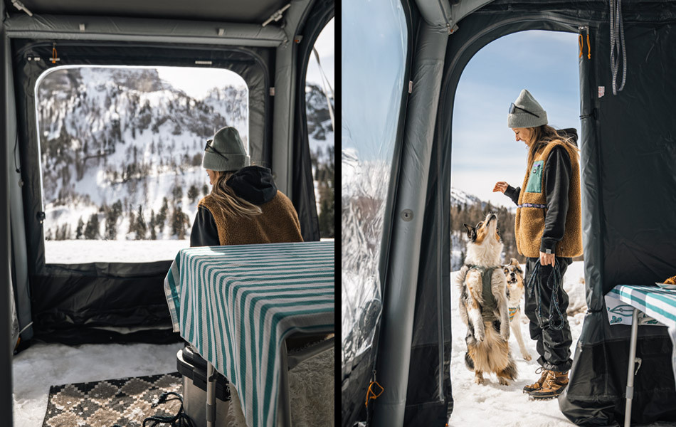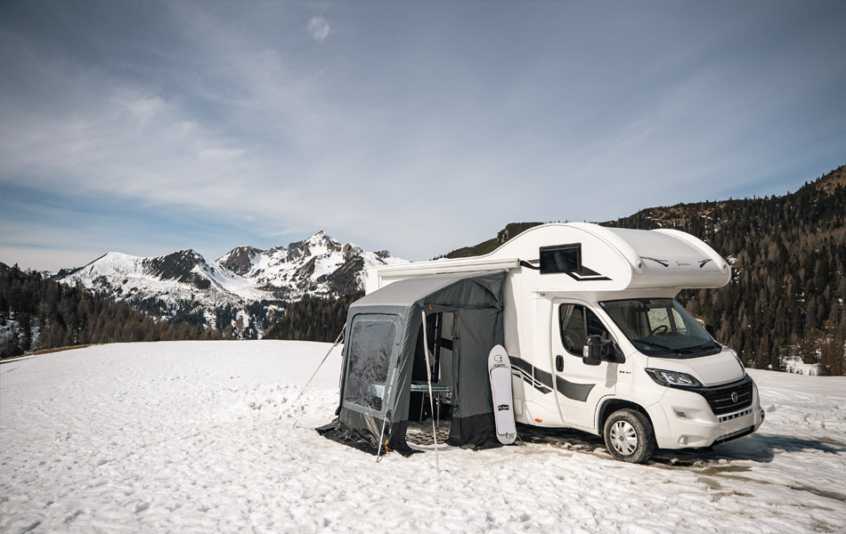 the awning comes standard ready for winter! Extra aluminium legs (winter poles) are included and mounted from the ground up to the roof. This allows the awning to withstand snow load. An inner roof and footprint are also included as standard to prevent condensation.