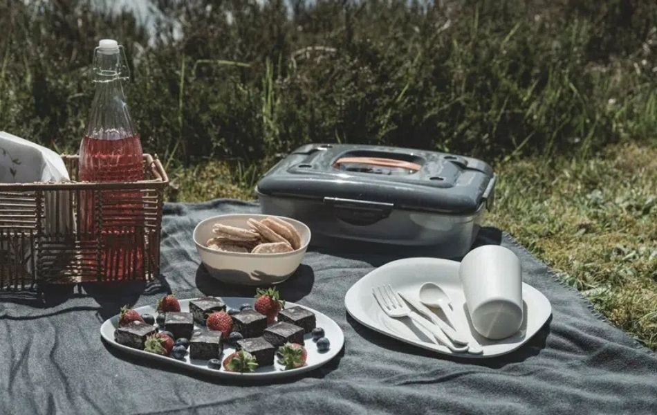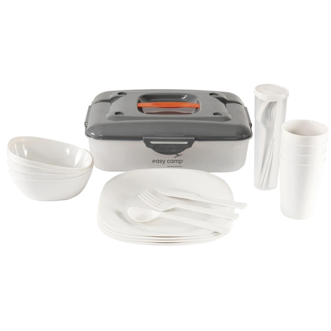 Content: 1 picnic box, 4 plates, 4 mugs, 4 bowls, 4 forks, 4 knives, 4 spoons