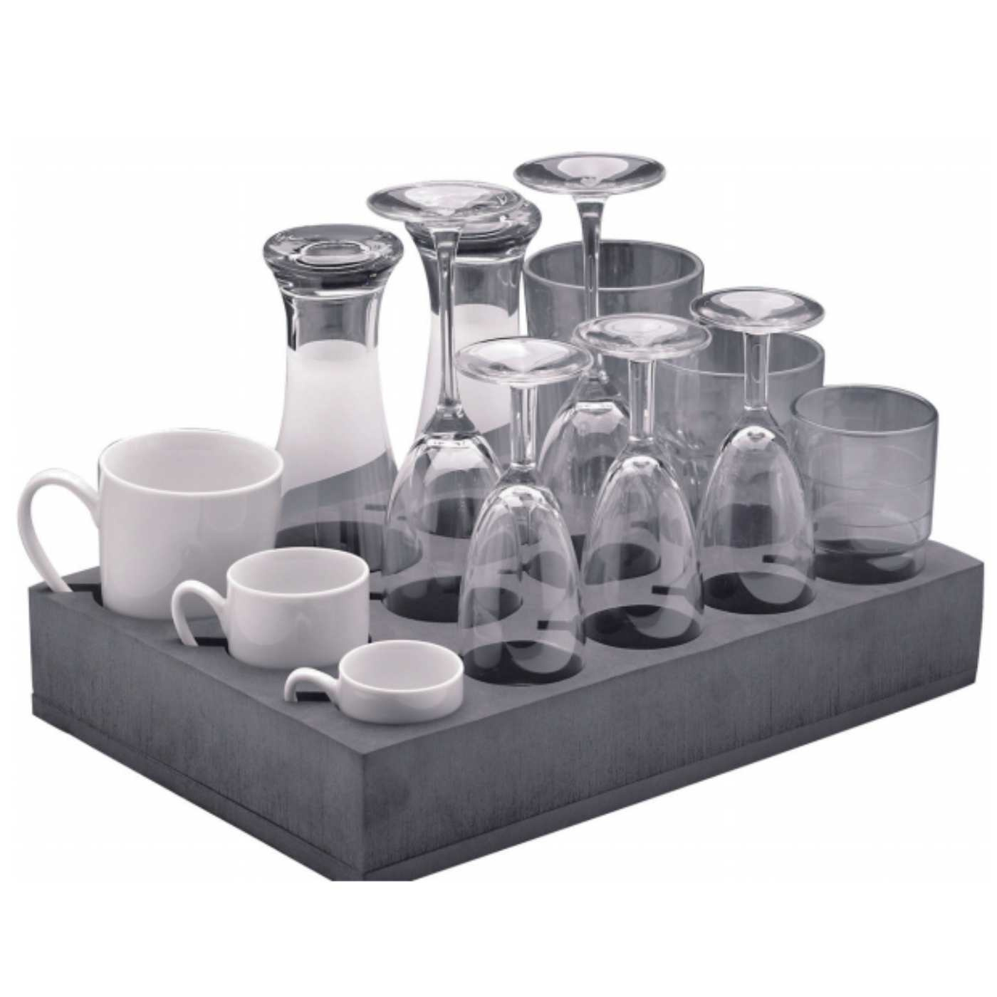 The holder has recesses in different diameters that fit standard sizes of glasses and mugs. - Characteristics