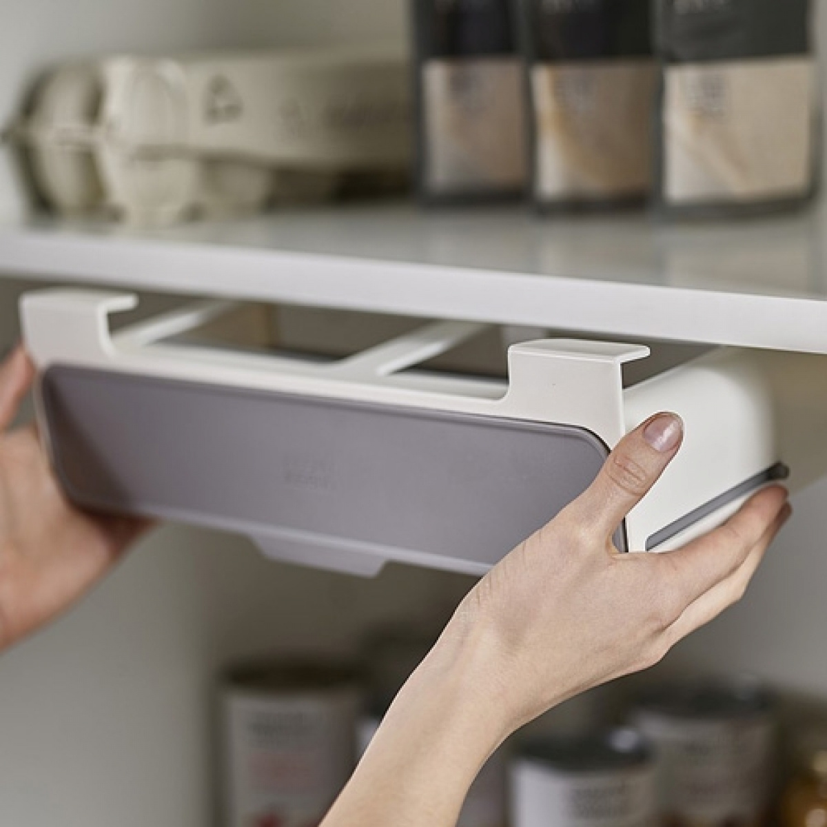 There is usually not enough space on the kitchen cabinet. With this innovative design, you can also utilise the otherwise unused space under the shelf. The smart pull-out compartment has room for up to seven standard-sized spice jars (not included in the delivery). It is easy to install with strong tape. The unit fits comfortably under your existing shelf. Suitable for kitchen furniture with a width of more than 32 cm and a maximum shelf thickness of 2 cm.
