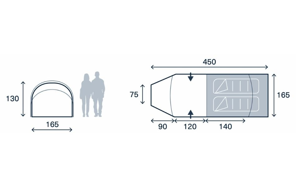 Lightweight 2 person tent with tunnel design, separate inner tent and vestibule area for gear storage. Perfect for hiking, cycling trips and convenient camping. Colour Mushroom grey