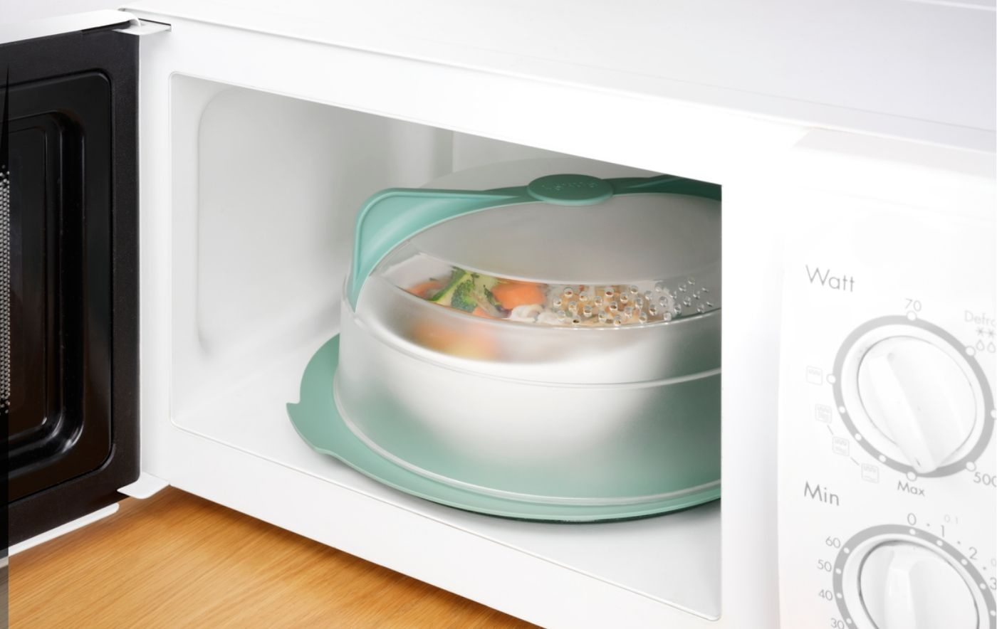 The smart cover has double-sided handles that make it easy to lift off, no matter how it has rotated during heating. The shape fits most plates and is designed so that the cover does not rest directly on the food. Steam is released in a controlled way, helping to retain moisture in the food while keeping the inside of the microwave clean.