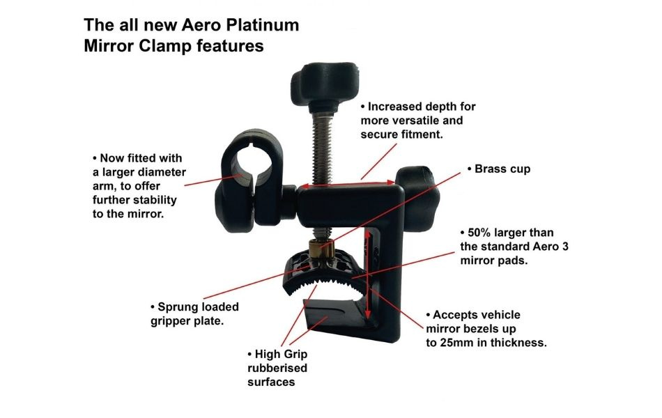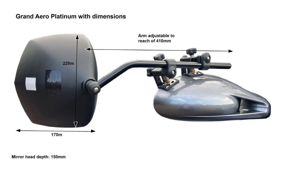 The Platinum clamp is enlarged to accommodate mirror frames up to 25 mm thick. The thicker arm offers added stability and reach for caravans up to 2.55 m wide. The mirror has high-quality automotive chrome glass and an aerodynamic design to reduce vibration while driving. Enhanced rubberized surfaces on both the clamp and pads prevent damage and corrosion.