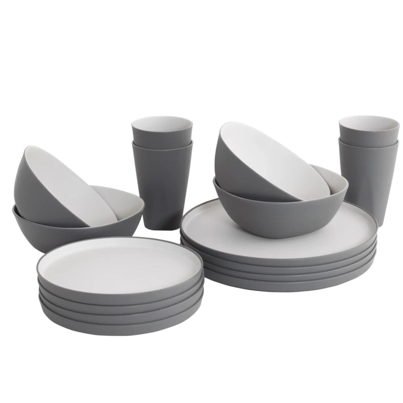 The set includes plates, bowls, and mugs and is designed to withstand an active outdoor lifestyle. The sturdy material makes the tableware safe to use even in vehicles where stability is important. The mugs have handles and are stackable for easy, space-saving storage. The non-slip base reduces both noise and movement during transport.