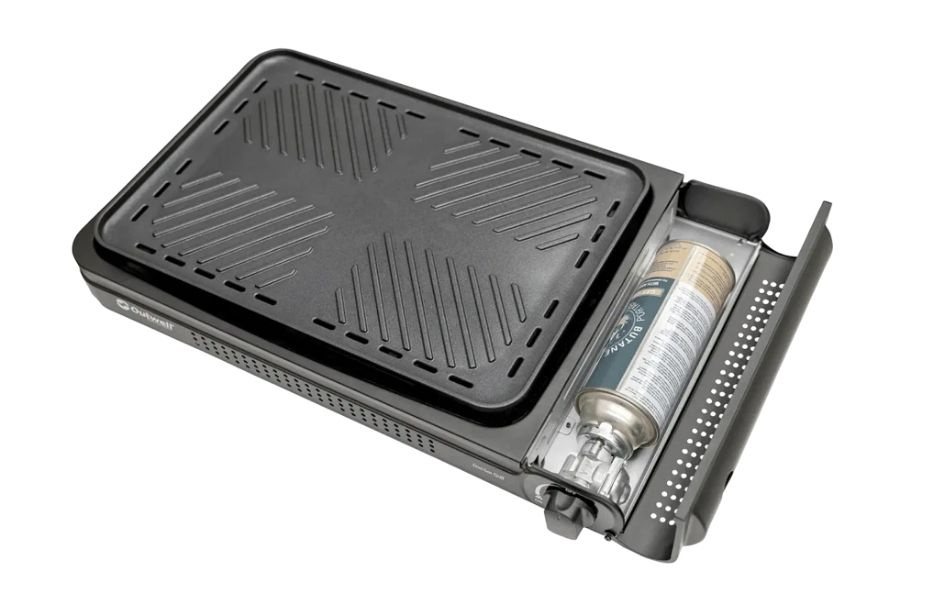 The removable non-stick grill with ceramic coating makes cleaning easy. The grill includes auto piezo ignition, built-in overheat protection, and a high-quality magnetic valve. It uses an MSF-1A butane cartridge integrated into the design, so no extra kit is needed.