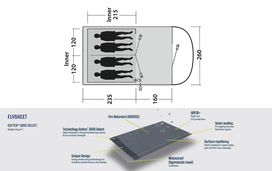 Groundsheet: Double-coated waterproof polyethylene