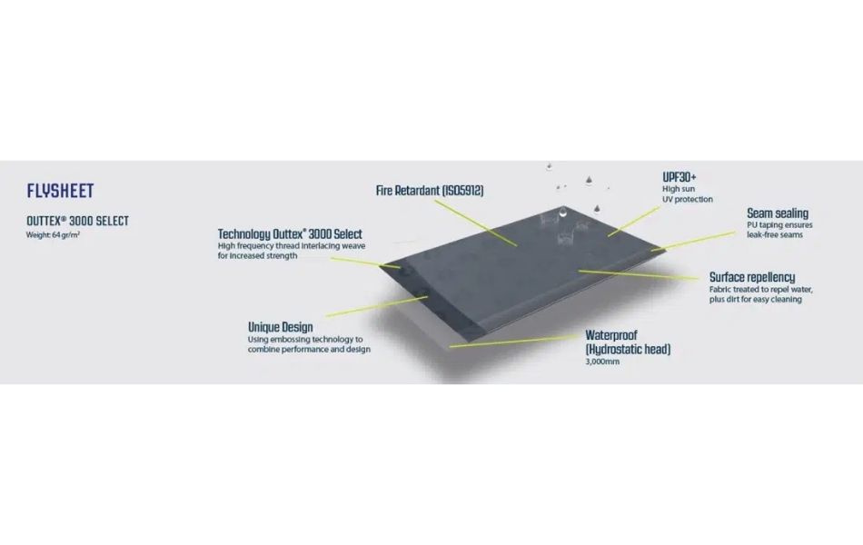 Textile fiber composition: Flysheet 100% polyester, Inner tent 100% polyester, Mesh 100% polyester, Carrybag 100% polyester