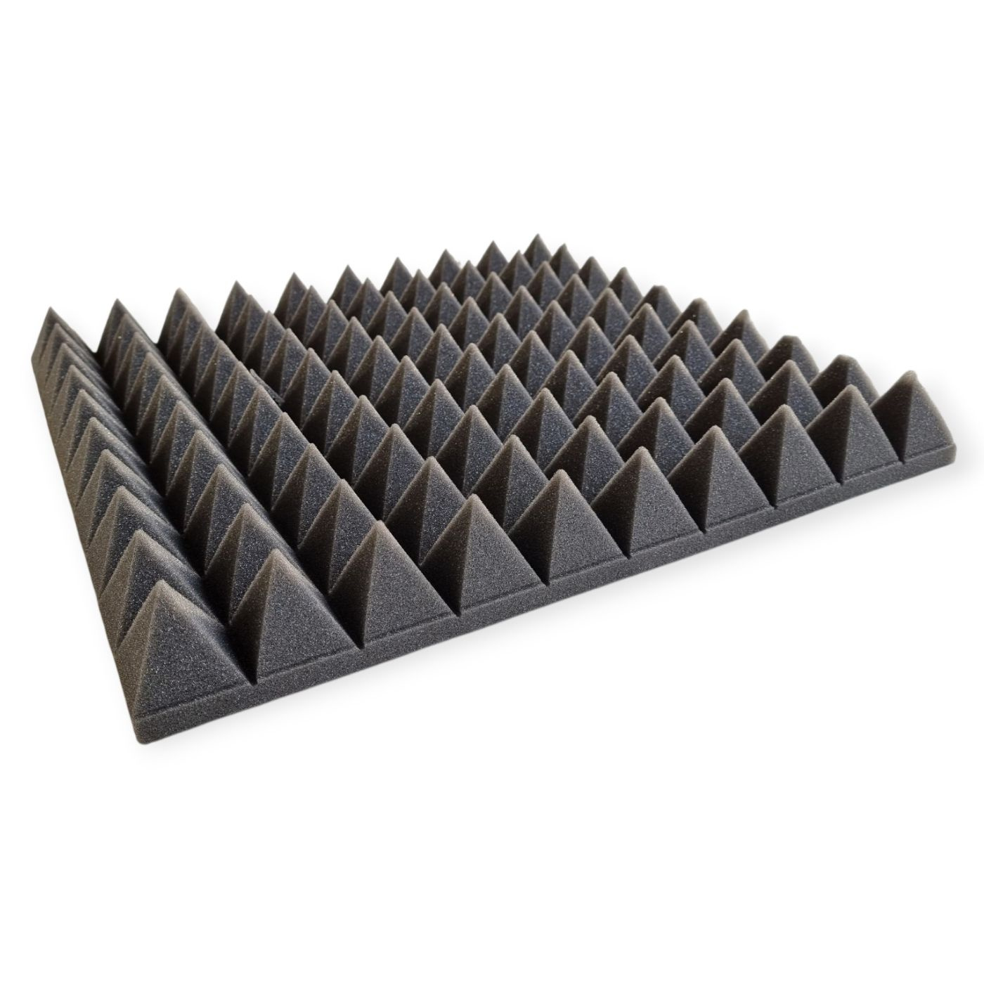 The panel is composed of selected polyurethane foam with semi-open cells, known for improving sound across most audible frequencies. The acoustic panel is shaped in a pyramid style that increases surface area, thereby maximizing diffusion and absorption, making it most effective for mid to high frequencies.