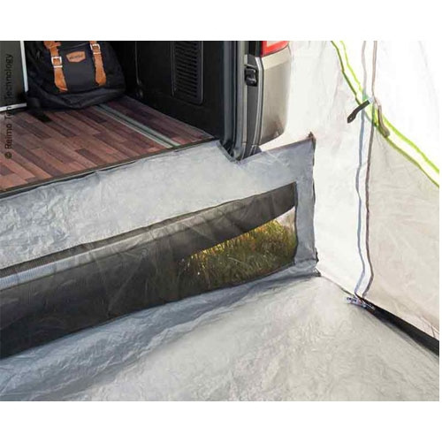 The tent is placed over the tailgate and then you have the tent ready. The outer door can be set up like an awning and the two side entrances have tinted windows. Upgrade Premium also includes mosquito nets in all sections, a skirt for the bumper, and the integrated floor mat provides extra comfort.