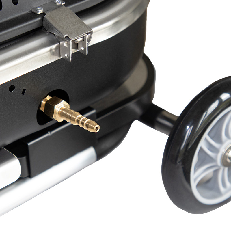 The barbecue operates with 30 mbar pressure from a gas bottle (hose and pressure regulator not included). Connection: 1/4” left-hand thread. Hose nozzle 8-10 mm included.