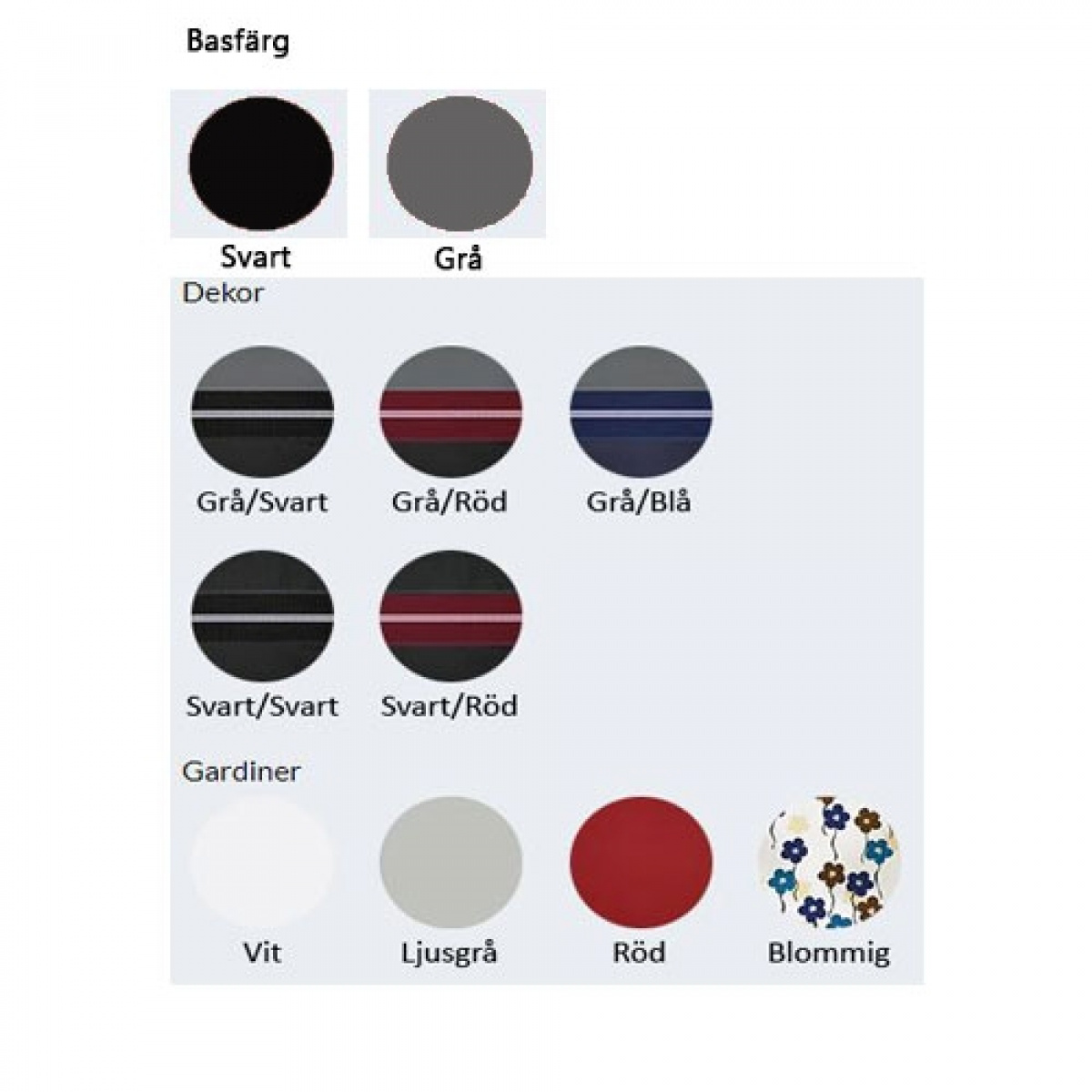 Choose between black or grey as the base colour. Then select which colour band you would like under the windows: black, blue, or red. Finally, choose which curtains you prefer: white, light grey, red, or floral.