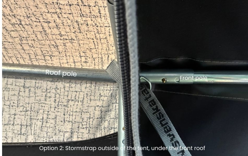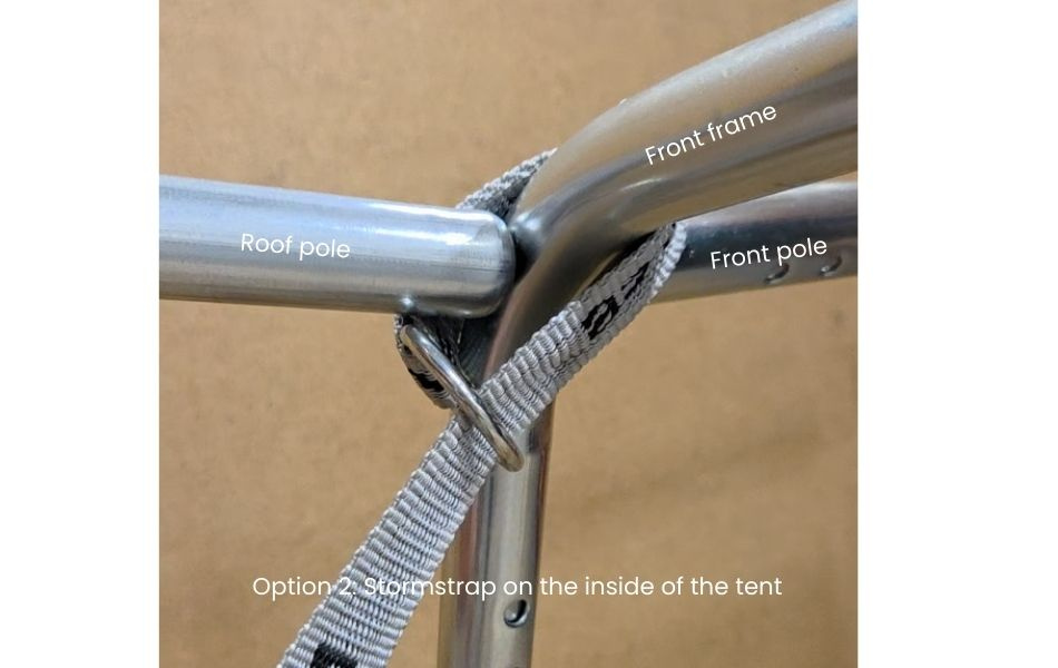 Mounting option 2: See image 3, around the corner joint between the roof pole and canopy pole, where the holder of the short strap is threaded outward through the hole, then the storm strap is pulled diagonally down toward the outer corner. This option is primarily recommended.