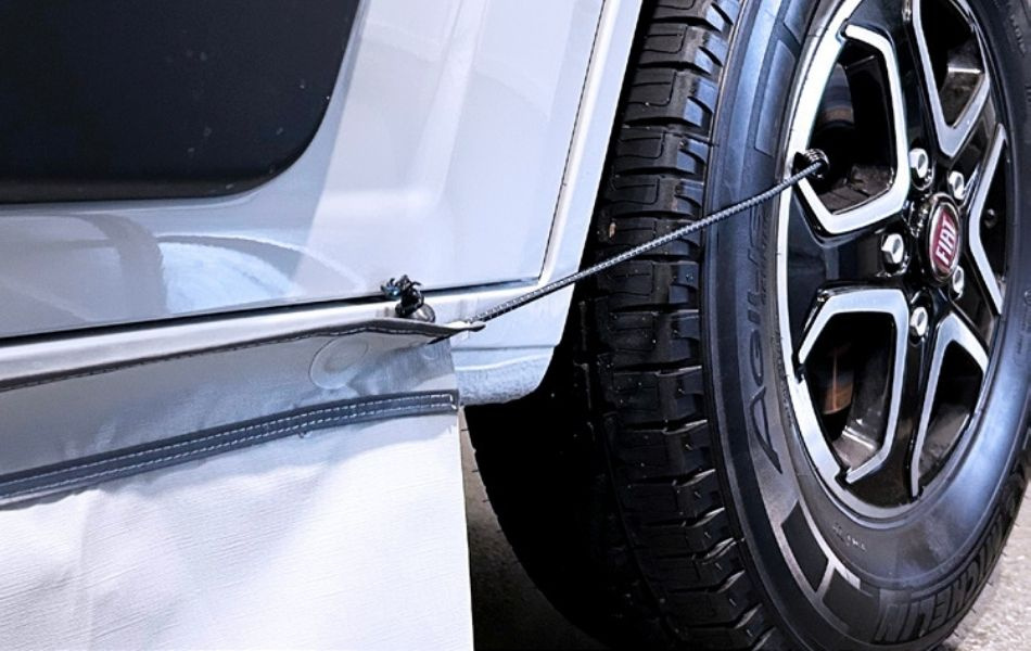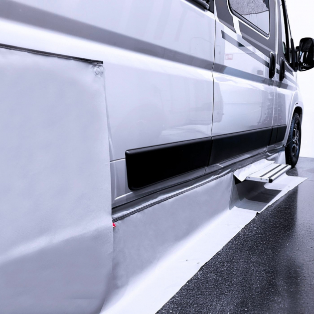 The underfloor consists of two parts: a long piece for between the wheels and a separate piece for the rear wheel. Made of durable PVC for long-lasting use and protection against weather. Magnets and elastic straps ensure easy, screw-free installation without making holes in the campervan.