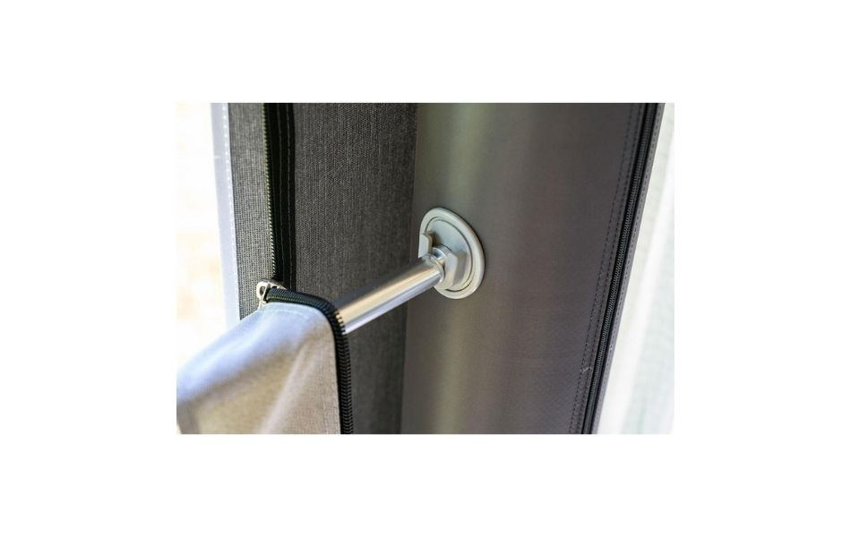 The awning is spacious with a depth of 250 cm and is available in three widths (260, 330, 400 cm) with an installation height of 240-260 cm. Sides and fronts can open fully to create a large sun canopy or roll to the side for extra doors and ventilation. The included veranda pole allows you to quickly create a cozy veranda. Front ventilation and side mosquito nets provide a comfortable indoor climate without insects.