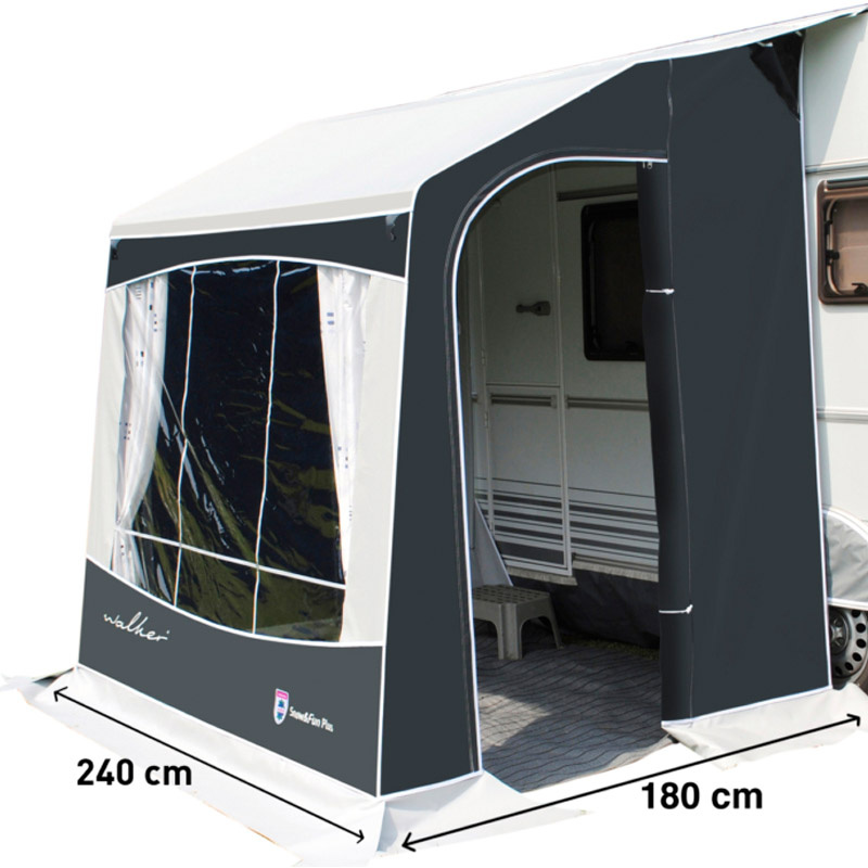 Snow & Fun Plus is a specially designed PVC winter tent. It is larger and more durable than many models from other manufacturers. The tent measures 240 cm in width and 180 cm in depth. There are ventilation openings on each side of the roof that can be closed from the outside. An optional thermal roof enhances the living climate. A safety package with extra poles is included, allowing the awning to support heavy snow. Snow & Fun Plus weighs approximately 28 kg.^