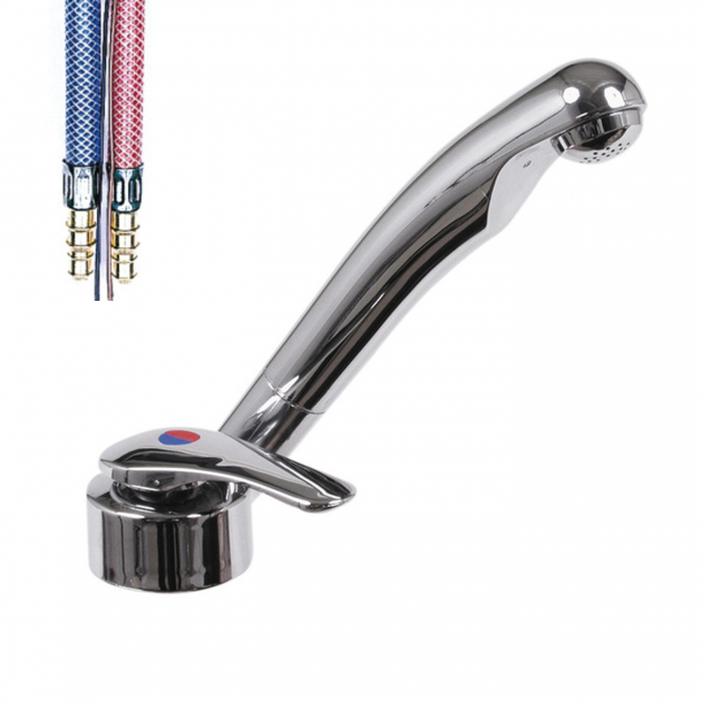 Since the threads on the taps have different dimensions, it is important to measure the correct hole dimension where the tap will be installed. There are different tap connections for each water system in the vehicle. Hose nipple connection is the most common where the soft water hose is pulled onto the tap's nipple and then sealed with a hose clamp. If the tap has a John Guest connection, you can easily connect the hard plastic water hose to the JG connection by inserting the water hose inside the connection, which is then secured with clips. The rapid connection has a metal thread where the end of the water hose for connection to the tap's rapid connection has a corresponding thread with a tightening nut. Uniquick connections are very common where the tap has hard plastic hoses attached to it. To connect them with incoming water hoses that are made of hard plastic, uniquick coupling connectors are needed. Water taps that have a brass quick connection also have a uniquick solution where you attach a uniquick connector to the nipple and then insert the hard water hose into the connector. Uniquick connectors have small clips that secure the hose or connection from the tap.When you want to insert the hose, you open the uniquick connector with a small latch so that the clips retract, then you insert the hose; when the hose is in the correct position, you release the latch so that the clips grip onto the water hose/tap's connection hose.